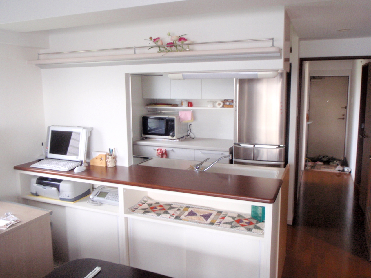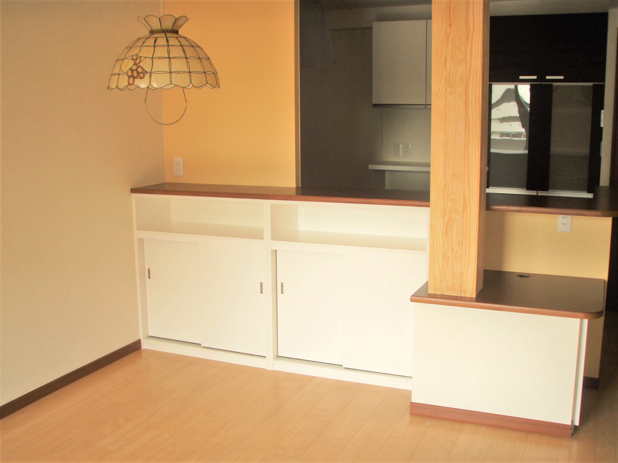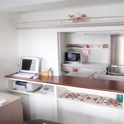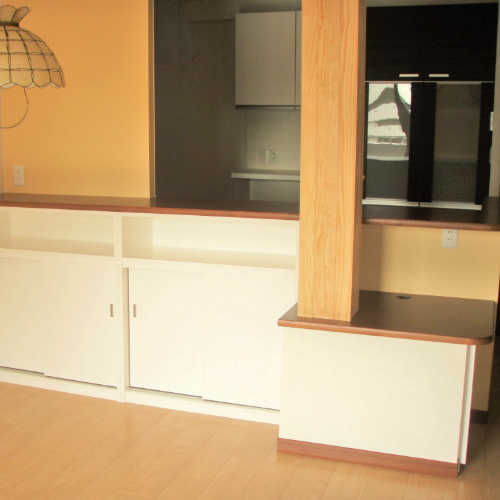 独立キッチンを対面キッチンに変更、カウンターの下に収納。上部には飾り棚。